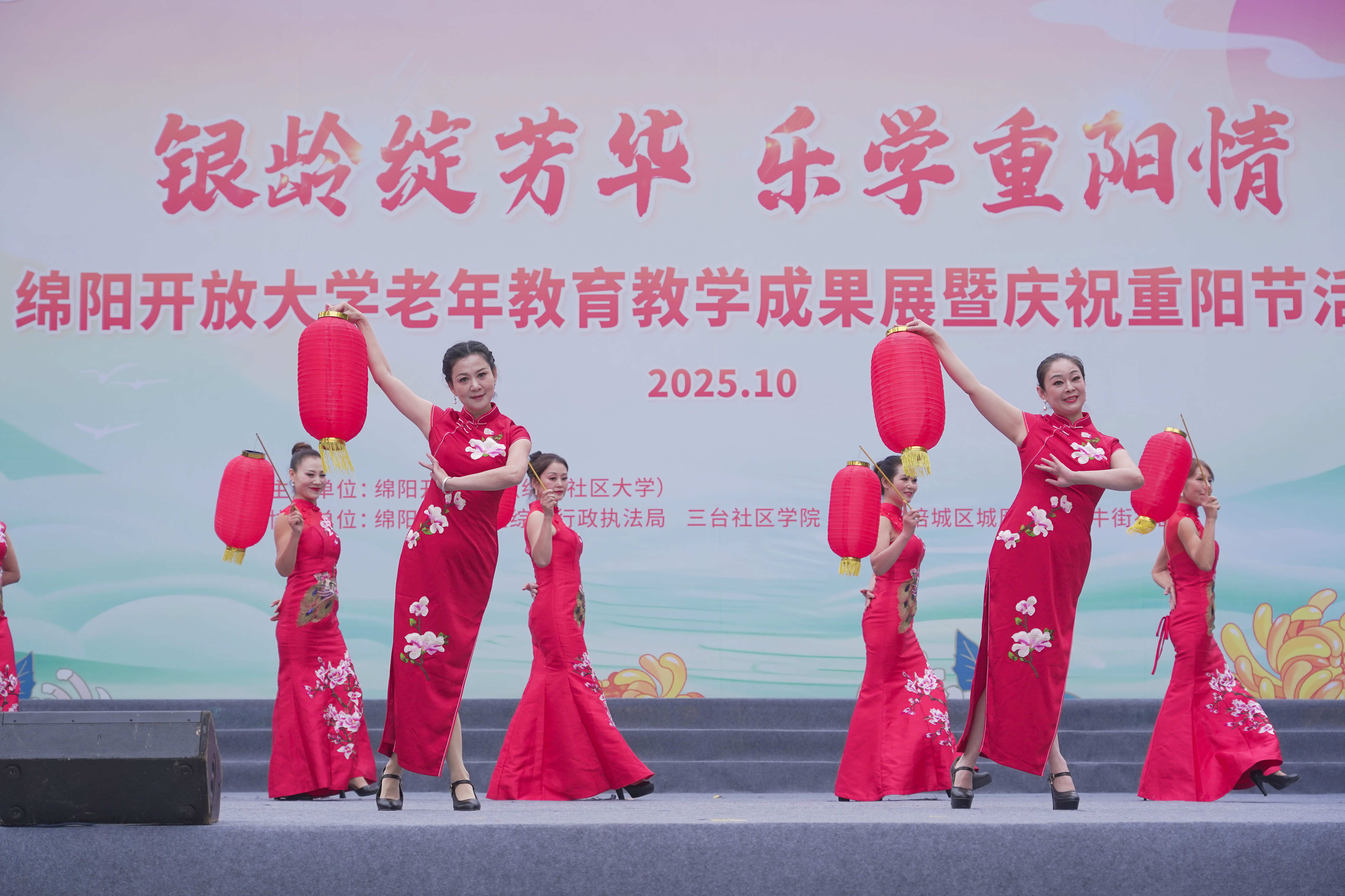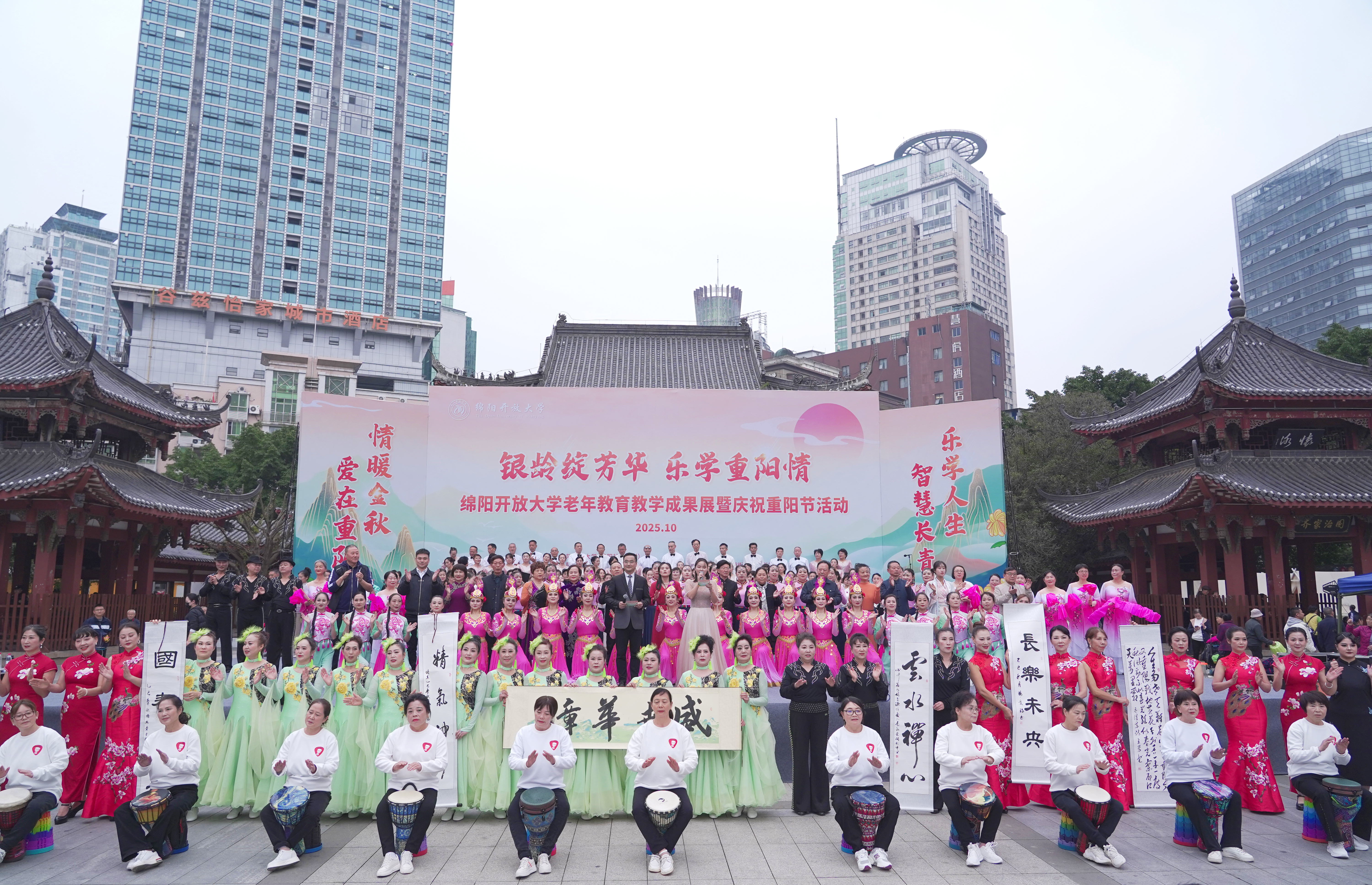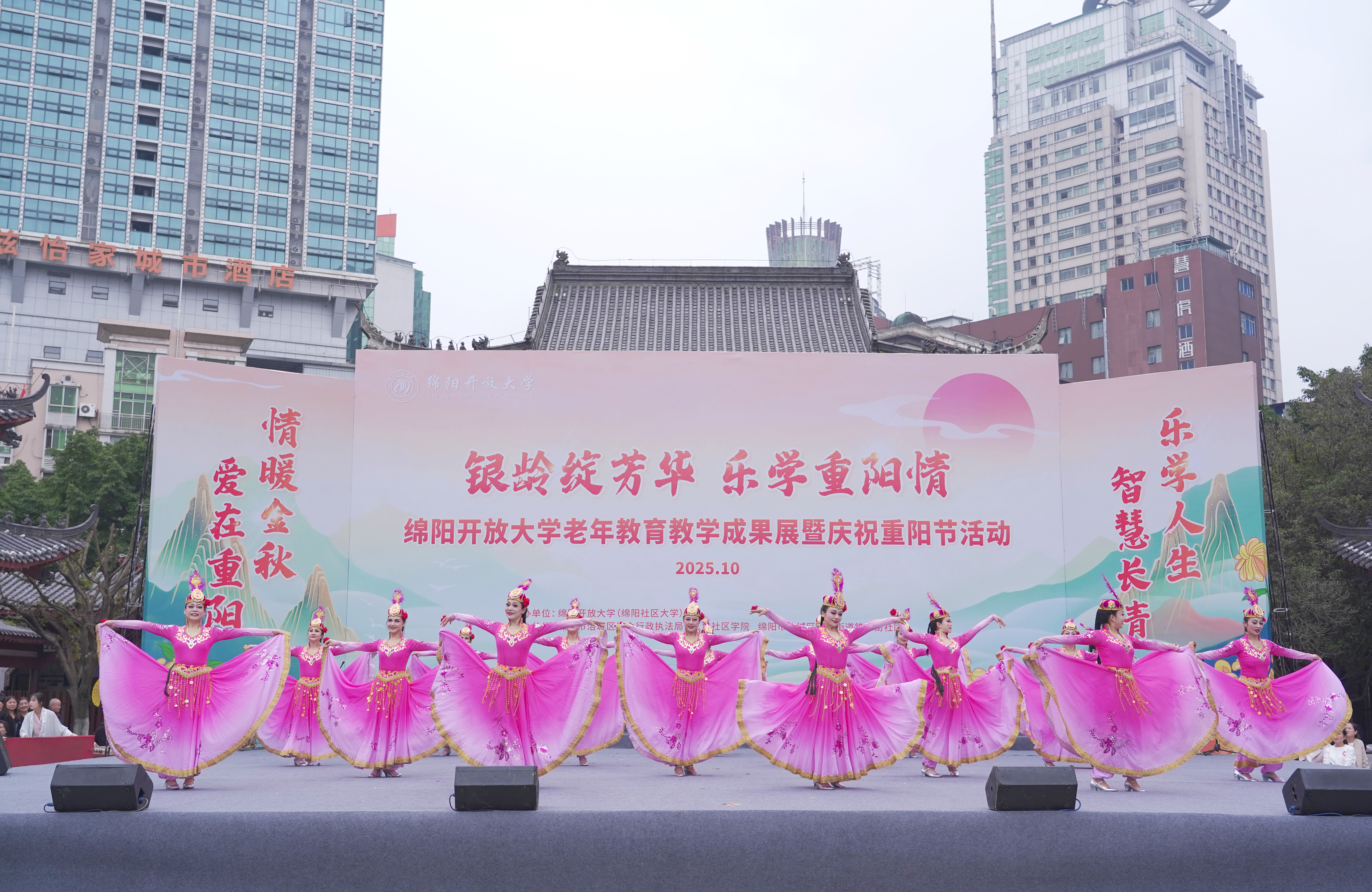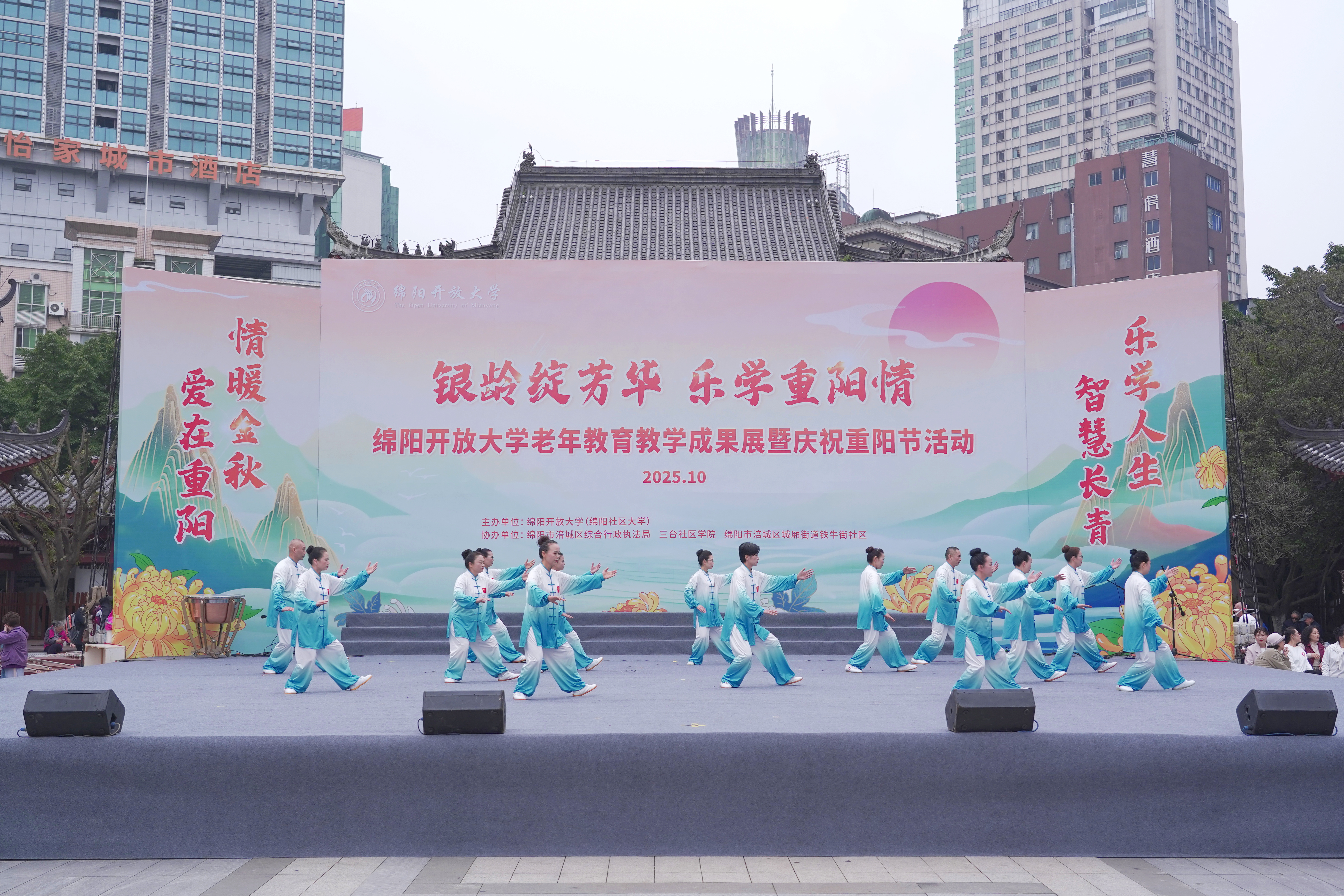 10月28日下午,绵阳开放大学(绵阳社区大学)于铁牛广场举行“银龄绽芳华 乐学重阳情”2025年老年教育成果汇报展演暨重阳节庆祝活动。绵阳市教体局相关领导、学校师生及近两千名市民群众齐聚现场,共同观看演出,喜迎重阳佳节。