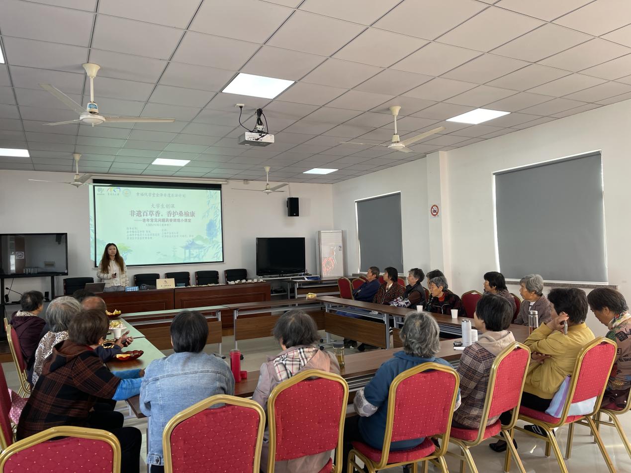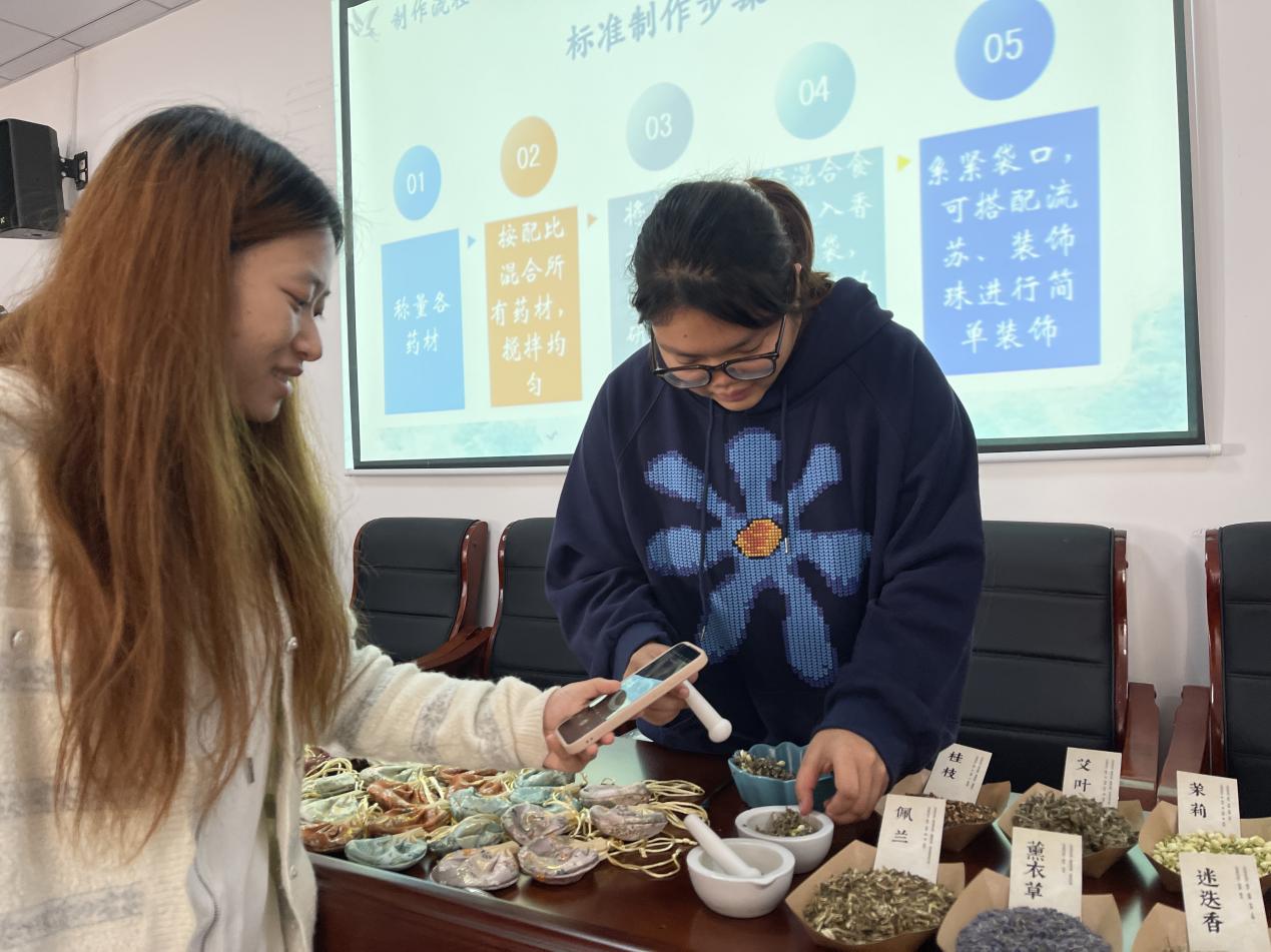 活动中,结合“幸福悦学堂•金泽非遗乐活计划”,上海中医药大学中西医临床医学专业大学生创课小组叶靖然、郭晗,结合村民实际需求,在指导老师金泽成校副校长陈岚及上海市中医药文化科普巡讲团成员、青浦区中医医院曹磐毅医师指导下,开展了“非遗百草香,香护桑榆康——老年常见问题药香调理小课堂”。课堂上,大学生们不仅讲解睡眠、情绪等老年常见问题的中医理论知识,还带领村民现场制作安神香囊,将传统文化转化为实用技能。